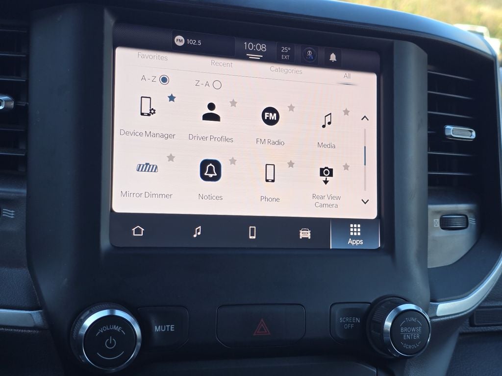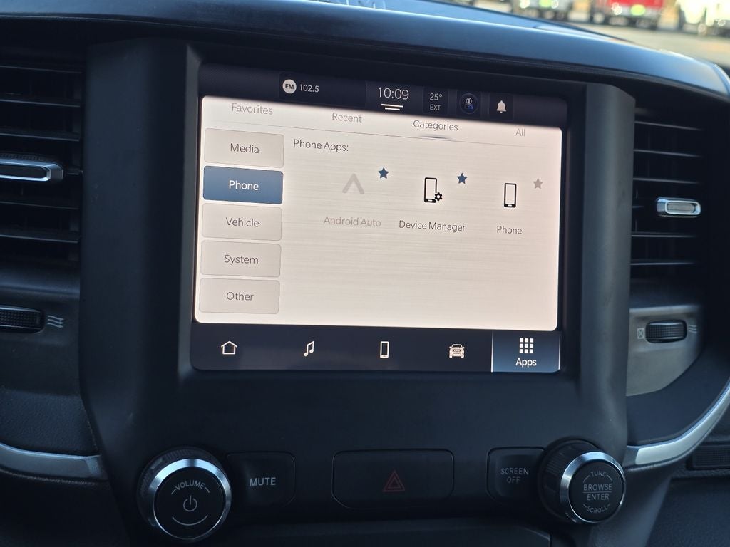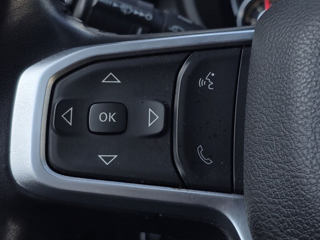 Quick Order Package 2GZ Big Horn. Level 1 Equipment Group: Google Android Auto; SiriusXM Radio Service; Bluetooth® Handsfree Phone and Audio; Integrated Center Stack Radio; For Details. Visit DriveUconnect.com; For More Info. Call 800-643-2112; Leather Wrapped Steering Wheel; Rear Dome with On/off Switch Lamp; Front Fog Lamps; Integrated Voice Command with Bluetooth®; Connectivity - US/Canada; Premium Cloth 40/20/40 Bench Seat; Glove Box Lamp; Auto Power-Folding Mirrors; Footwell Courtesy Lamp; 4G LTE Wi-Fi Hot Spot; GPS Antenna Input; Exterior Mirrors with Heating Element; Global Telematics Box Module; Mirror Running Lights; Uconnect 5 W Radio with 8.4" Display; 8.4" Touchscreen Display; Foam Bottle Insert (door Trim Panel); Black Exterior Mirrors; 18" X 8.0" Polished Aluminum Wheels; Apple CarPlay; Big Horn Instrument Panel Badge; Power Adjustable Convex Aux Mirrors; Forward and Reverse Utility Lights; Locking Lower Glove Box; Selectable Tire Fill Alert; SiriusXM Satellite Radio; Power Heated Fold Telescope Mirrors; Exterior Mirrors with Supplemental Signals; Steering Wheel Mounted Audio Controls; Exterior Mirrors Courtesy Lamps; Dual Glove Boxes; Center Hub; Power Adjust Mirrors; 2nd Row in Floor Storage Bins; Power Telescoping Mirrors. Premium Cloth 40/20/40 Bench Seat. Chrome Flat Cab-Length Side Steps. Granite Crystal Met CC. Front Fog Lamps. Tow Hooks. **Equipment listed is based on original vehicle build and subject to change. Please confirm the accuracy of the included equipment by calling the dealer prior to purchase.**